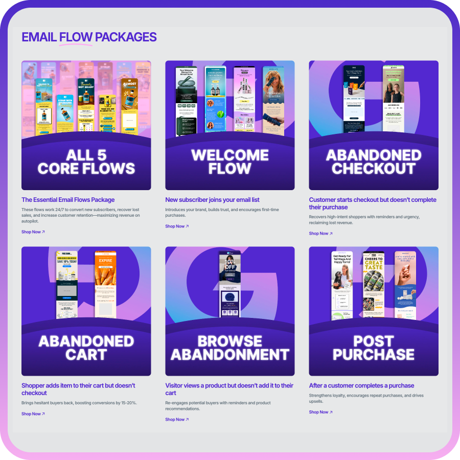 Email flows turn subscribers into customers and customers into loyal fans. They work 24/7 to automate sales, recover revenue, and build loyalty.